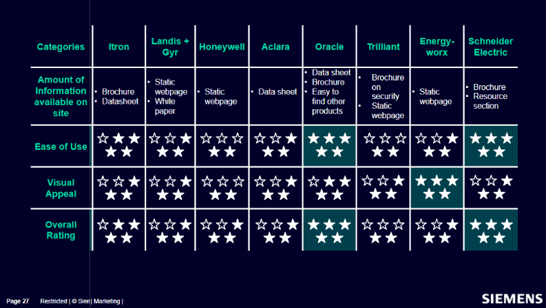 Benchmarked Siemens' product offering website against competitors in following categories: visual appeal, ease of navigation, and content relevance.