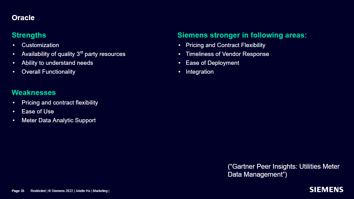 Top competitors identified included Oracle, Itron, Landis+Gyr, and EnergyWorx. Competitors like Trilliant and SAP were noted as weaker due to limited usability and scalability.
